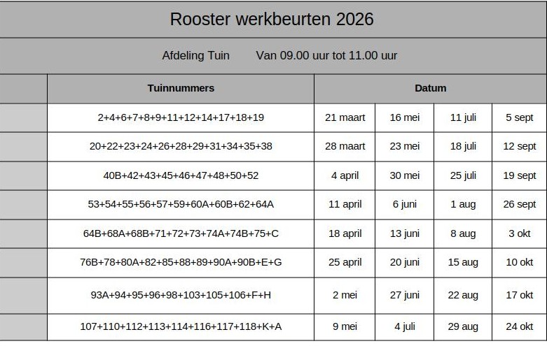 Werkbeurten worden gemaakt volgens onderstaand rooster. Voor een niet gewerkte werkbeurt wordt € 40.- in rekening gebracht.